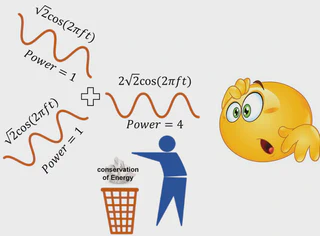 where and are the amplitude and time period of the signal , respectively. Accordingly, the power of signal is units. Now consider case 2: where we have a constructive combination of two exactly identical signals. By the superposition principle, we have . Using the power definition, the power of the combined signal is units. However, the total power of the individual signals is only units. An obvious but strange question arises: where did the extra units of power come from? This gives birth to the paradox and the apparent failure of conservation of energy.